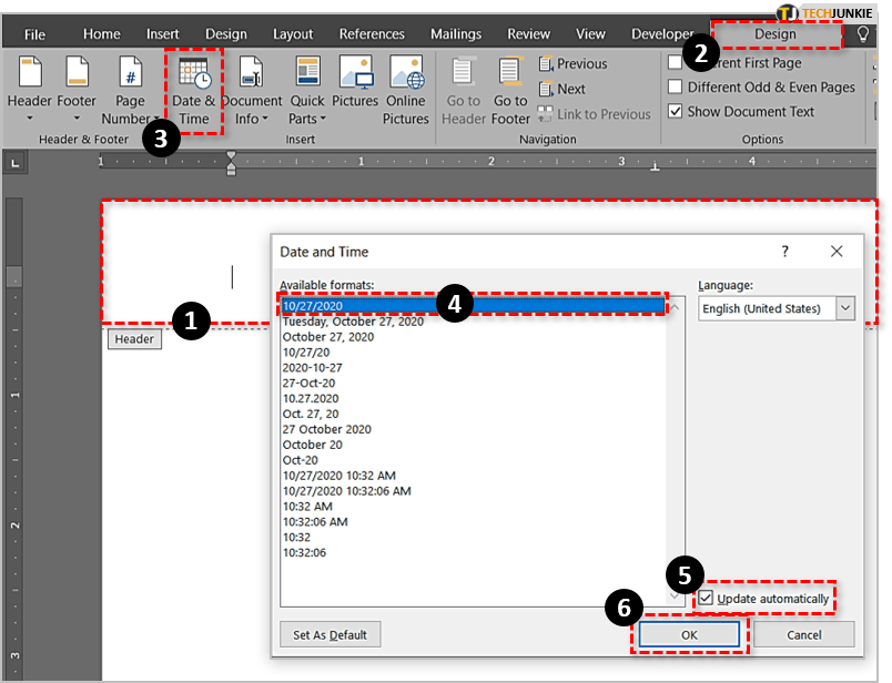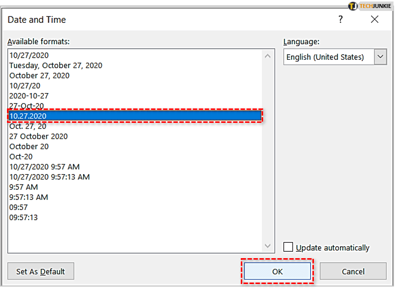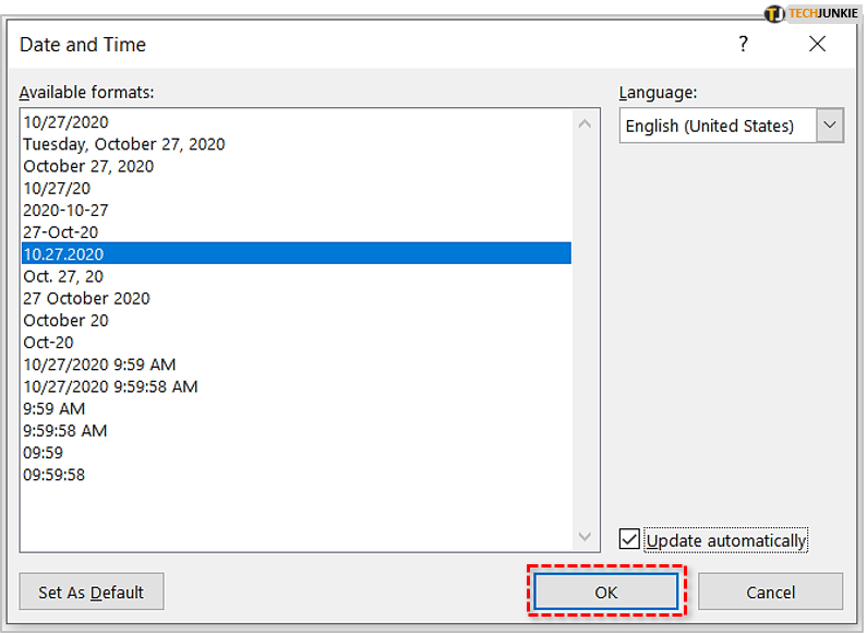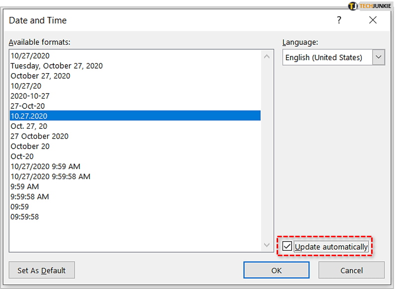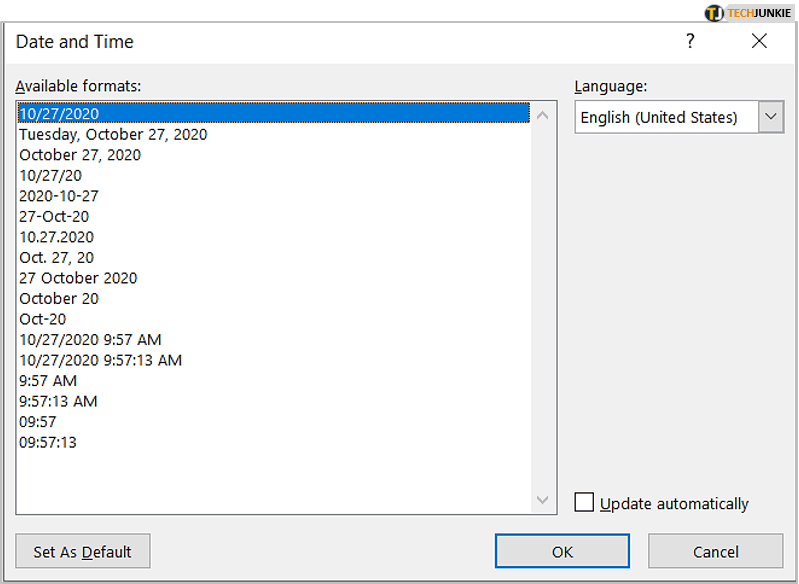 4. 当“日期和时间”对话框出现时,您将能够选择一种格式,如果需要,请选中“自动更新”框,然后单击“确定”保存并关闭。
