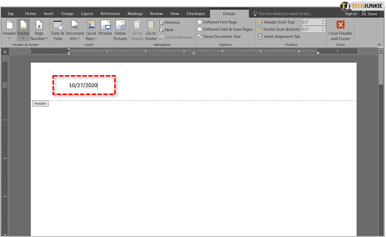 1. 双击页眉或页脚.这将打开 Header &页脚工具。