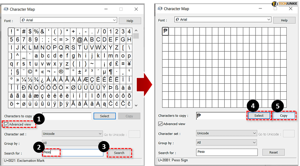 要查找菲律宾比索,请打开字符映射中的高级视图选项.在搜索栏中搜索比索,然后点击选择,然后点击复制。这会将符号复制到剪贴板,您可以在此处根据需要将其粘贴到文档中。顶部的下拉菜单将允许您选择要使用的字体。