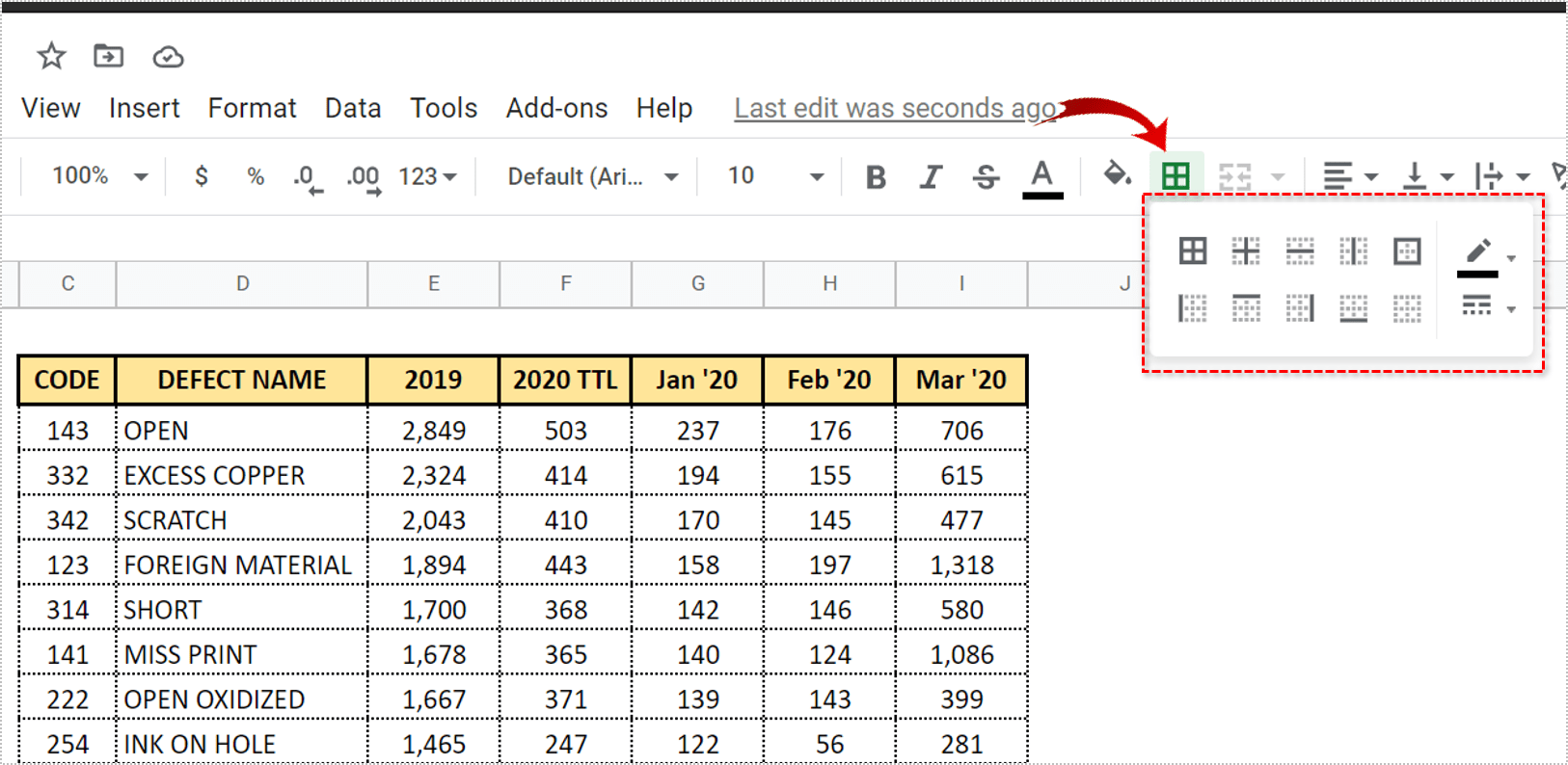使用它很简单,只需选择要应用边框的区域,然后单击对应于边框样式。所有边框图标将重新启用整个选择中的所有网格线。 Inner Borders 会做同样的事情,但会省略任何外线。外边框是相反的,它会创建一个框,而将内部留空。