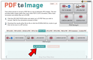 例如,PDF to Image 有一个易于理解的界面。只需点击页面底部的“上传文件”图标,然后选择您的 PDF 文件。