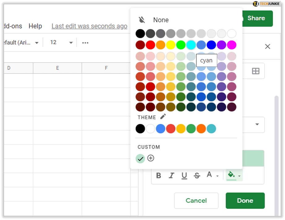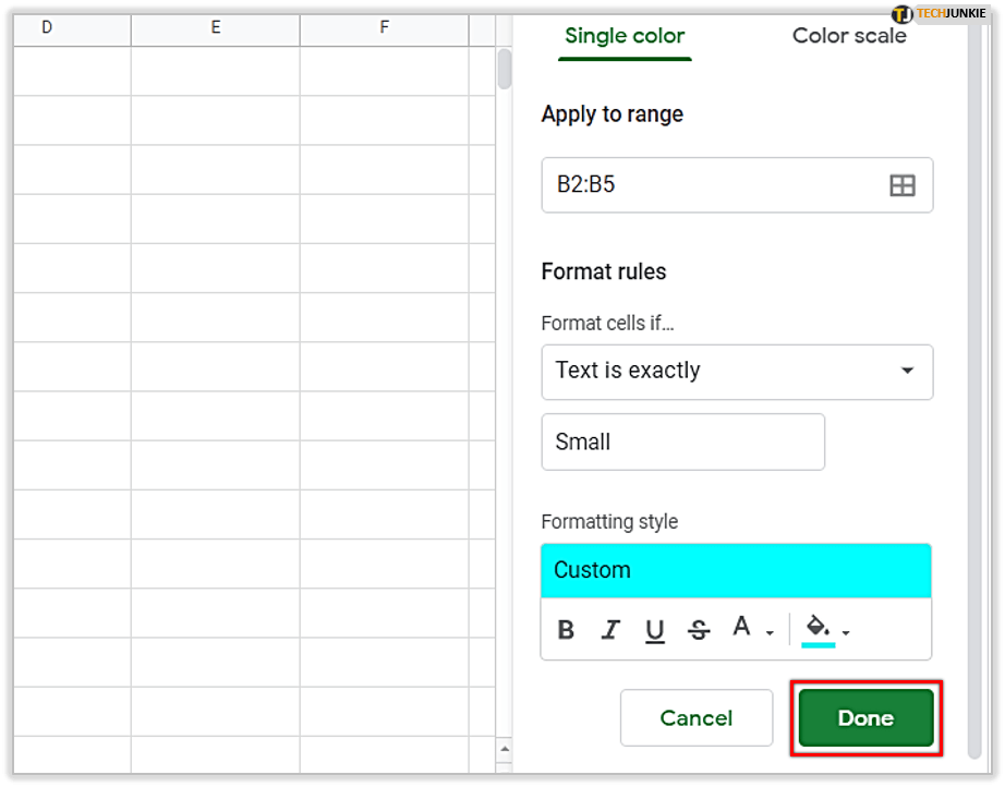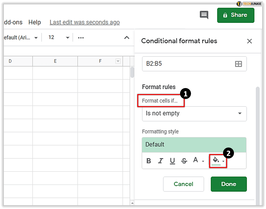 - Google 表格右侧会出现一个弹出窗口。在“如果...格式化单元格”中选择格式化条件,在右下角您会看到一个油漆桶图标;点击那个。