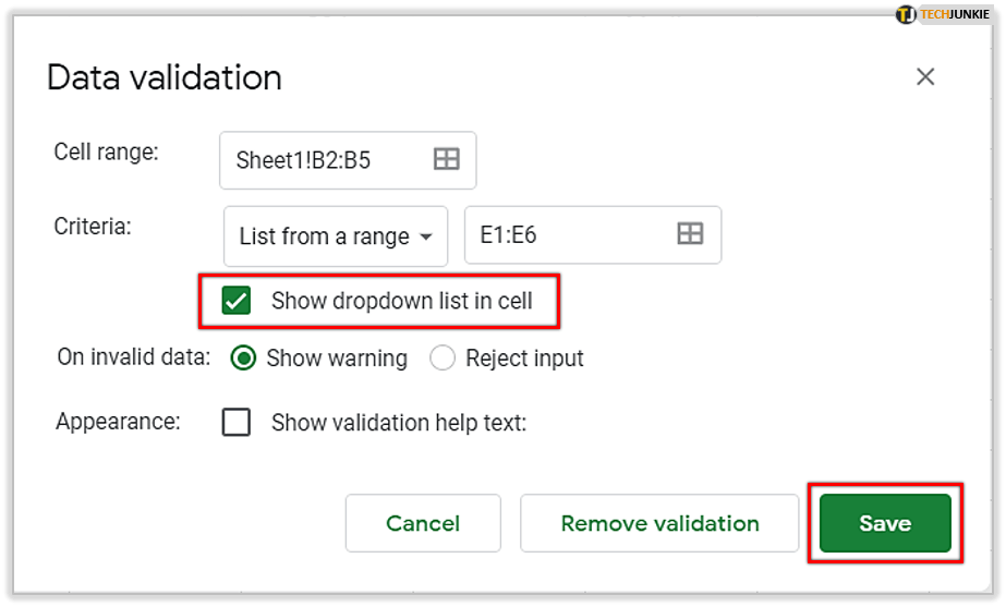 - 确保选中“在单元格中显示下拉列表”。如果您愿意,可以添加帮助文本和错误信息,然后单击“保存”。