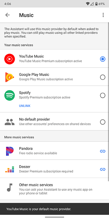 首先,打开您的 Home 应用并选择应用底部的个人资料图标。查找设置选项,然后选择“服务”选项卡。从此列表中选择音乐,然后选择 YouTube Music 作为您指定的默认音乐服务。由于您已经在 Home 中登录了您的 Google 帐户,因此您不必再次登录。