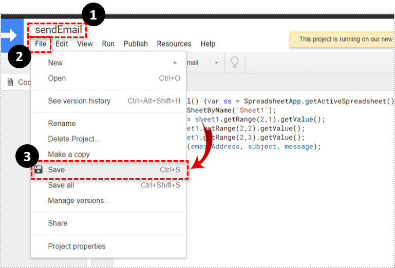 下一步是保存此脚本。通过单击“文件”选项卡上方的“未命名项目”为脚本指定名称。例如,您可以使用函数名称作为参考,因此键入“sendEmail”.单击顶部菜单中的“文件”选项卡,然后单击“保存”。