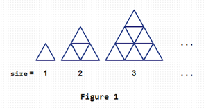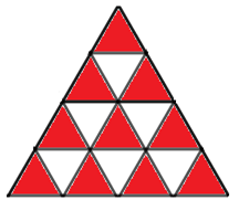 当i=3时,对应图中上三行,可以看成是在上两行(i=2)的基础上增加第3行扩展而来,此时,增加了边长为1的小三角形有5个,其中3个顶点向上(红色三角形),2个顶点向下(白色三角形);增加了边长为2的三角形有2个,顶点均向上;增加了边长为3的三角形1个,顶点向上,所以,a[3]=a[2]+5+2+1=13,