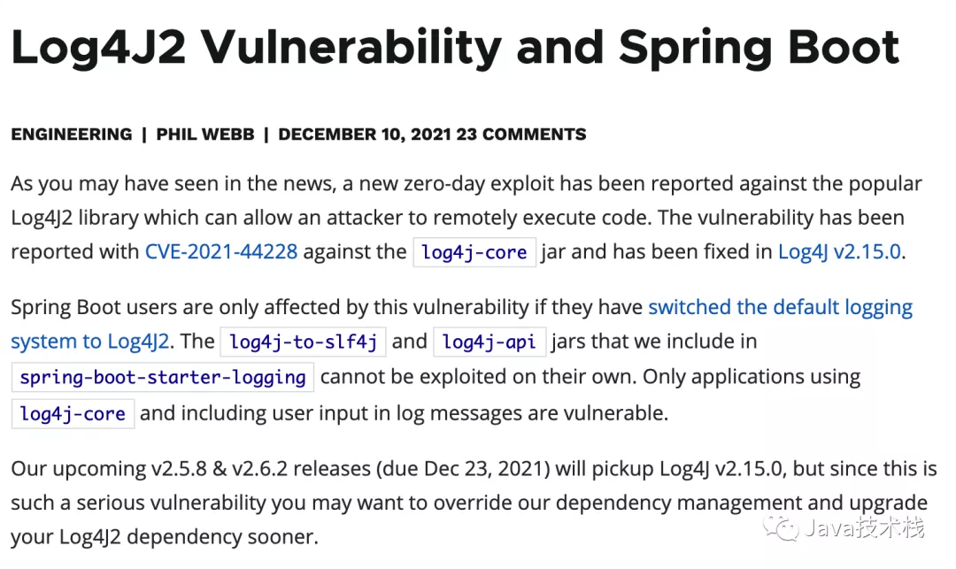 关注公众号Java技术堆栈的小伙伴应该都知道,在前些天的《最新!Log4j 2.x 再发版,正式解决核弹级漏洞,又要熬夜了,,,》这篇文章中,堆栈长有提到,为了应对及解决 Log4j2 的核弹级漏洞,Spring Boot 会在 2021/12/23 左右发布新版: