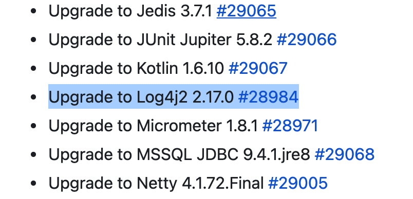 当然,如果只是为了解决 Log4j2 的漏洞而升级 Spring Boot 主版本,如果不是必须,追最新版本那大可不必,解决漏洞可以只升级 Log4j2 的版本即可,