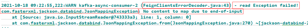 匹配第1个Pattern 匹配结果: ('WARN', 'FeignClientsErrorDecoder.java', '43', ' - read Exception failed!', 'com.fasterxml.jackson.databind.JsonMappingException', ': No content to map due to end-of-input', '\n at ')