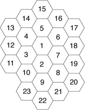 蜜蜂生活在一个蜂巢里,一个蜂巢由许多六角形的小巢房组成,我们将任意一个小巢房标记为数字1,然后以顺时针方向标记剩余小巢房来标记这些巢房,如下图所示,