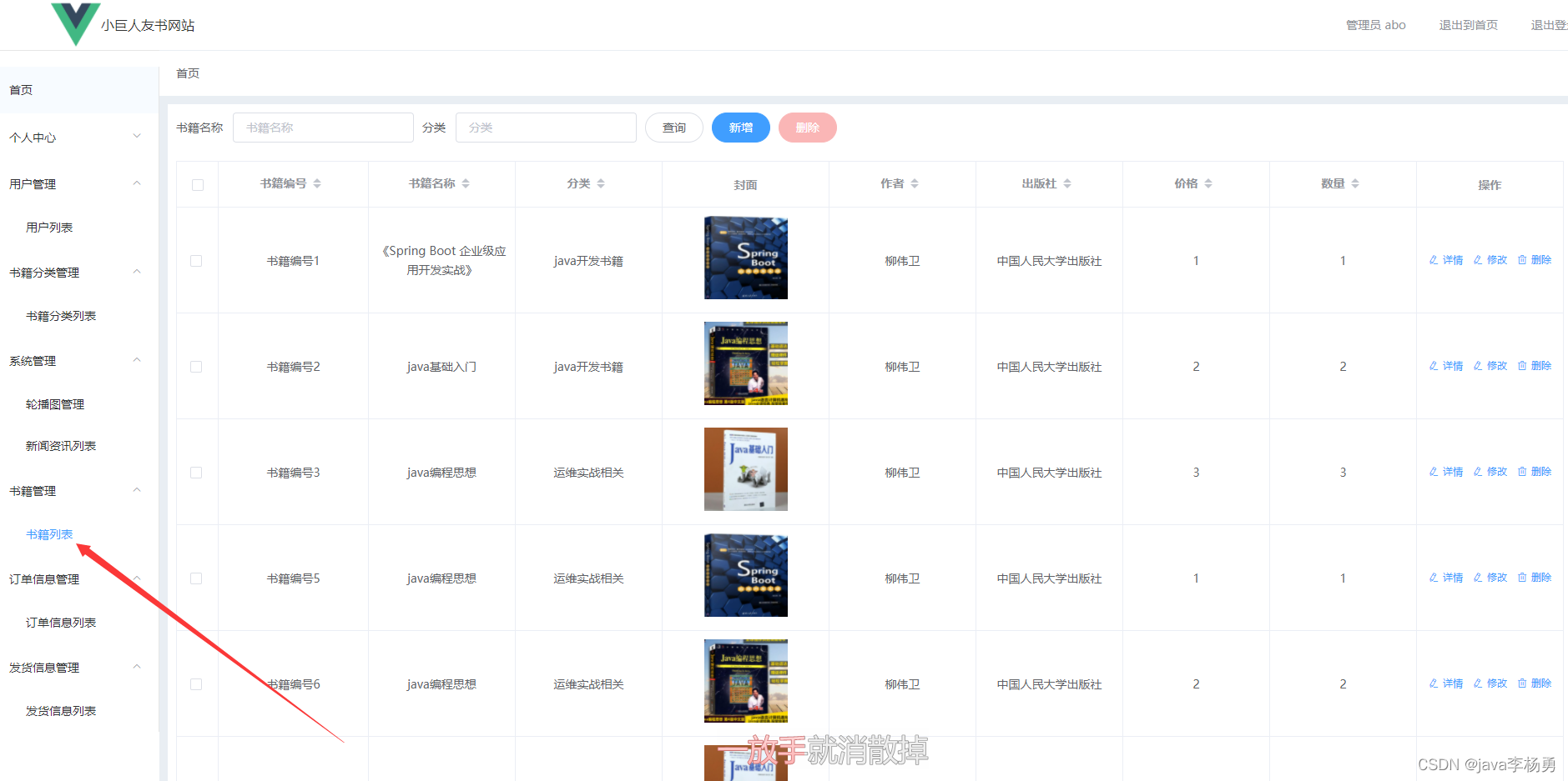 管理员首页:图书商城系统管理员登录后主要有如下功能模块:用户个人信息管理、修改密码、图书分类管理、图书商品详情管理、首页轮播图管理、新闻信息管理、书籍串列管理、订单信息管理和发货信息管理等,